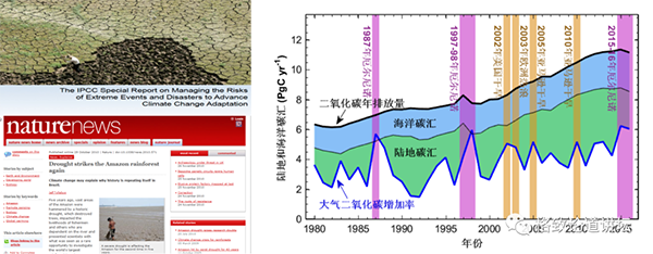 ▲左:欧洲干旱;右:陆地和海洋碳汇变化图