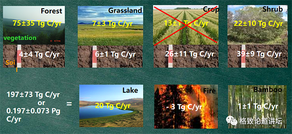 上图是我们目前估算的森林、草地、农田、灌木,湖泊和竹林这些不同的生态系统的碳汇的情况。我们要强调的是,农田里边虽然农作物产量增加很多,但是因为这部分碳很快就被人消耗掉,它的周转是非常快的,所以这部分我们不去考虑。