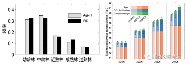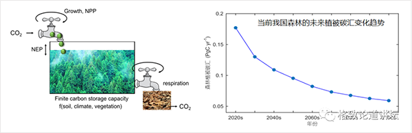 从右边的图里我们可以看出来,随着2100年到来的时候,目前森林生态系统的碳汇能力是会显著下降的。所以我们现在的植树造林和森林管理是非常有必要的。怎么把碳汇窗口期的时间延长、什么时候要造林、在哪儿造林,这都是需要去综合规划的。