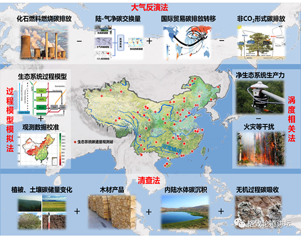 为了回答这一问题,我们有好几种方法,传统方法是跑到野外、挖个土去看一看这里面的碳储量到底有多少,现在也有一些新的高技术方法。中科院地理所的于贵瑞老师,他们是利用涡度相关的技术来估算生态系统碳汇,还有一些是基于卫星的数据估算,还有的方法是利用大气二氧化碳浓度的观测数据进行反演模型。我们在这个研究里边用了传统的地面观测和大气的反演模型的方法。