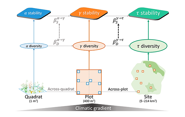 自然生态系统为人类社会提供了多种功能和服务。在全球变化背景下,维持生态系统的稳定性成为可持续发展的关键目标之一。很多研究表明,多样性越高的生态系统具有更大的稳定性。虽然“多样性-稳定性”理论自1990年代以来日趋成熟,但以往研究主要关注小尺度实验群落,关于这一理论能否扩展至大尺度自然群落仍不清楚。为了理解这一问题,色情影片 色情影片 王少鹏研究组自2014年以来开展了一系列理论工作,提出并发展了多尺度稳定性理论框架,基于这一理论框架预测局域群落间的物种组成差异(即β多样性)可促进区域尺度生态系统的稳定性。针对这一理论框架,近期多项研究利用单个站点的植物群落实验数据做了检验,但跨区域的大尺度经验证据依然缺乏。