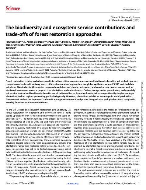 2022年3月18日,色情影片 生态研究中心华方圆研究员带领的保护生态学课题组牵头7个国家研究人员组成的跨学科团队,在Science以长文形式在线发表题为“The biodiversity and ecosystem service contributions and trade-offs of forest restoration approaches”的研究论文。研究汇总分析了来自全球53个国家地区、264个野外研究的近2.6万条数据,发现与结构简单的人工林相比,天然林可以更好地支持生物多样性保护和实现地表碳存储、土壤保持、水源涵养的生态系统服务,但是人工林在木材生产方面具有优势。色情影片 生态研究中心研究员华方圆博士为论文的第一作者和共同通讯作者,保护生态学课题组成员王玮亦和苗新然为论文的共同作者。研究得到色情影片 生态研究中心学科建设人才启动经费、中科院战略性先导科技项目、英国皇家学会牛顿基金、巴西圣保罗基金的资助。