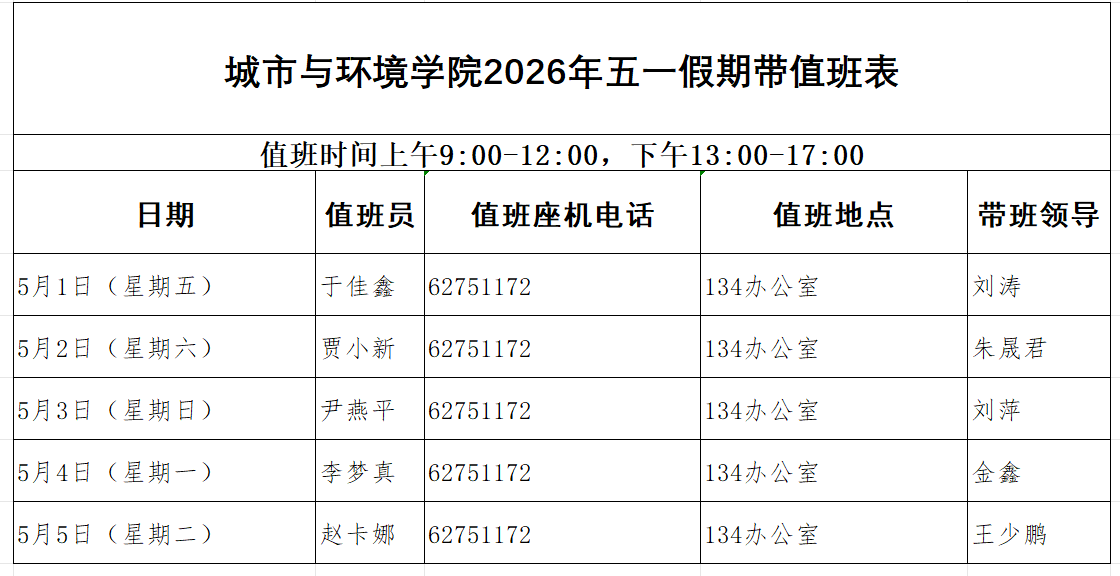 按照学校要求,五一放假期间,学院安排院领导带班和工作人员值班。值班人员在岗值班时间为9:00—17:00,领导在京带班时间为9:00—次日9:00。