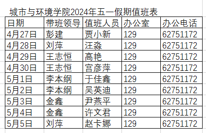 按照学校要求,五一放假期间,学院安排院领导带班和工作人员值班。值班人员在岗值班时间为 9:00—17:00,领导带班时间为 9:00—次日9:00。