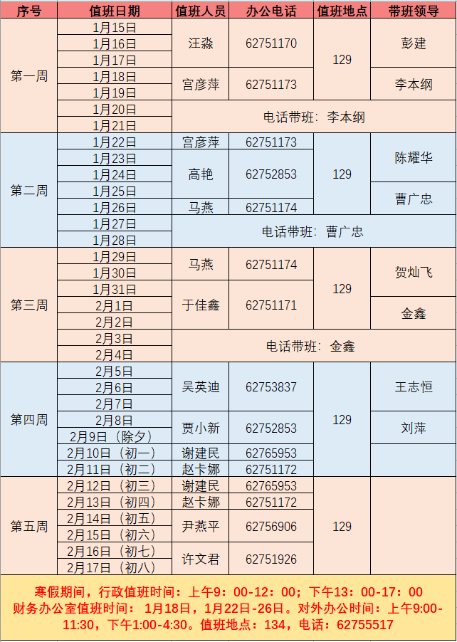2. 学院财务办公室寒假值班日期为1月18日、1月22日-26日。值班日对外办公时间为:上午9:00-11:30,下午1:00-4:30,地点:134,电话:62755517。