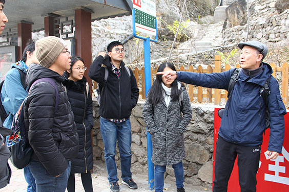 在参观完特色建筑之后,同学们自发前往金蟾山的观景平台。一路上都是陡峭的山路,没有护栏的保护,同学们彼此鼓励,相互扶持,最终成功登顶,一览全景。此刻正值初冬,爨底下村显得草木萧瑟,山土贫瘠,仿佛是一个缩小版的黄土高原。支部中有很多环境专业出身的同学,就爨底下村的生态环境现状展开了讨论。古村群山环抱,空气湿润清新,相比正笼罩在严重雾霾中的城市,爨底下村犹如一个世外桃源。但是整个村落的植被覆盖度比较低,十分荒凉,大片的土地可以被开发利用,栽种植物,推动整个村落生态环境的优化。此外水土保持也是一个值得关注的问题,古村处于环山的地理位置,如果不重视水土保持,突发暴雨时容易造成山体滑坡、泥石流等灾害,危害居民的人身安全。