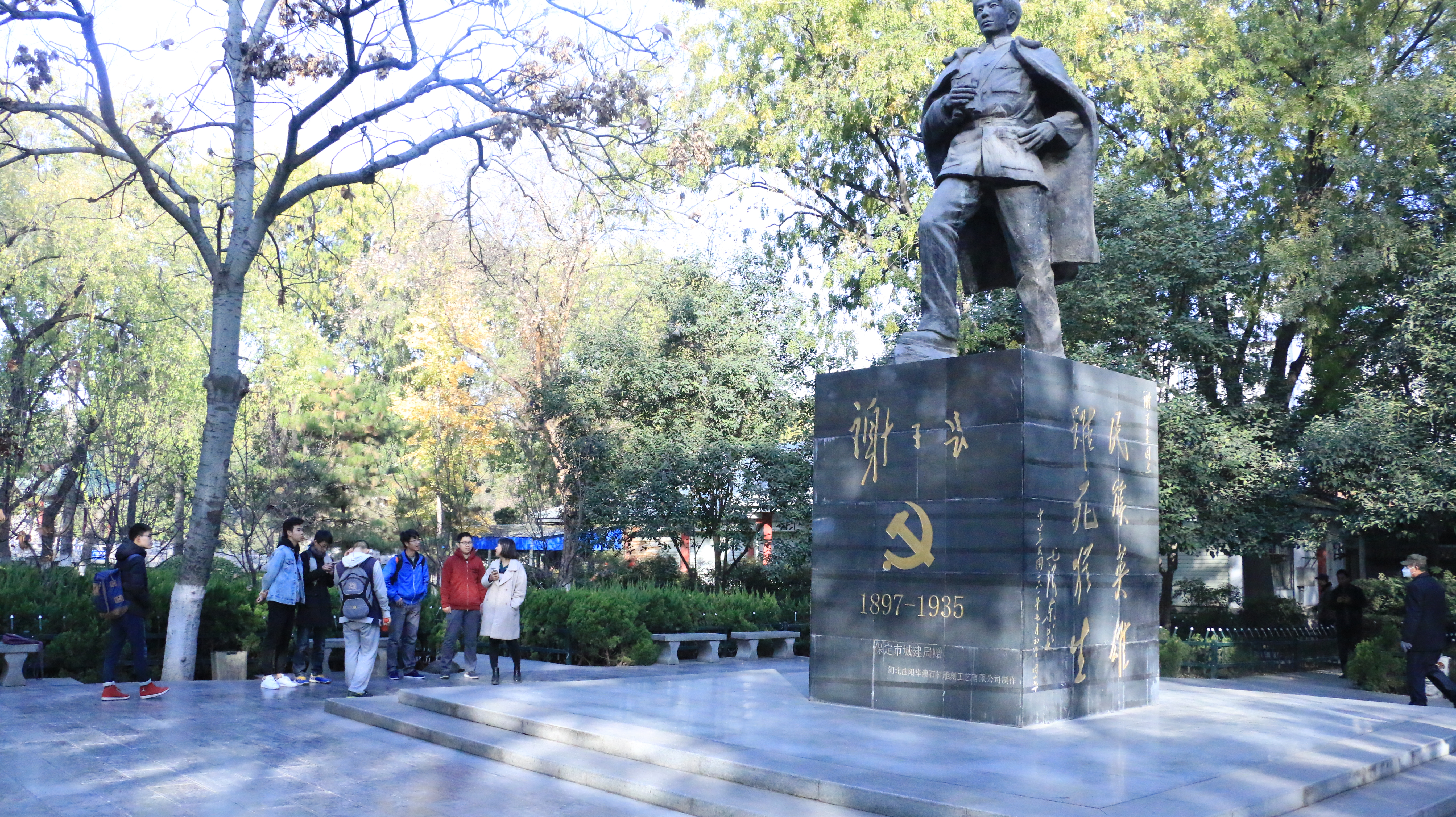 11月25日清晨,实践团到达西安火车站。在短暂的休息之后,同学们首先前往西安市革命公园进行参观学习。革命公园中,有谢子长、刘志丹同志以及杨虎城将军的人物雕像以及纪念西安围城死难军民的革命亭,同学们在革命先辈的雕像面前,一边查阅资料,一边讨论历史。