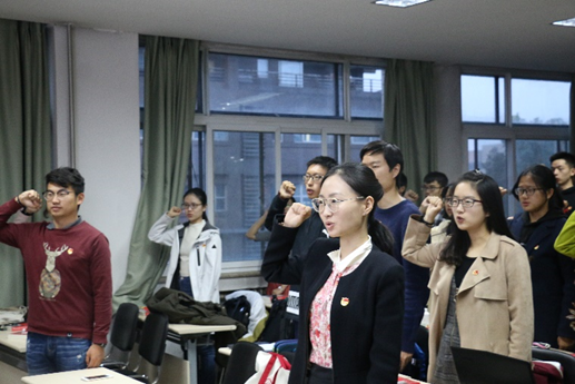 接下来,同学们在关汉岳的带领下重温了入团誓词。誓词虽短,却蕴含着当代青年积极向上的精神风貌,凝聚着共青团员报效祖国的满腔热血。同学们在誓词中回顾着共产党、共青团革命斗争的艰苦历程,更加坚定了不忘初心、牢记使命,为国家、为人民无私奉献的决心。
