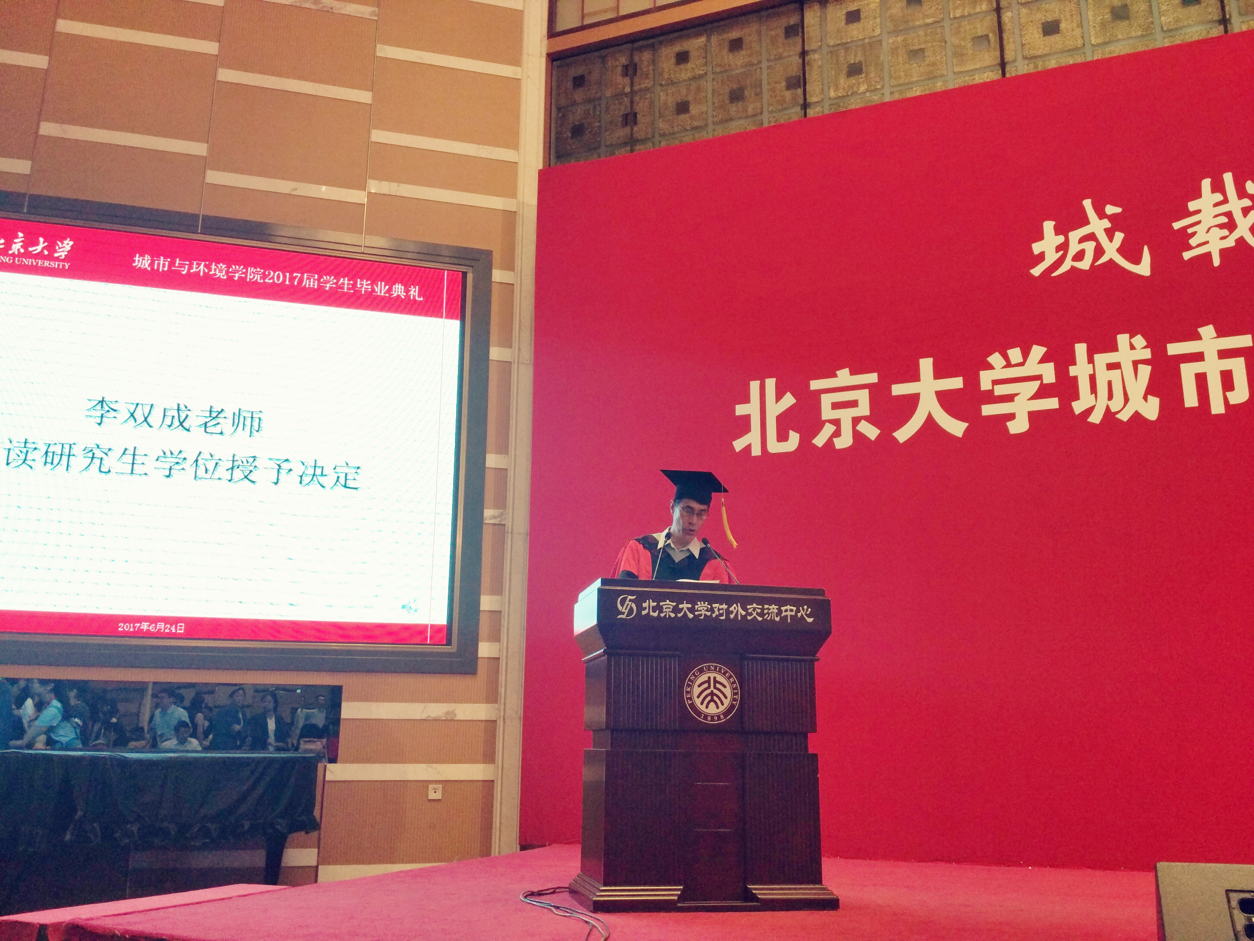 学院副院长李本纲老师、李双成老师分别宣读本科生、研究生学位授予决定,院长贺灿飞老师和党委书记刘耕年老师为学生拨穗、颁发纪念证书并合影。