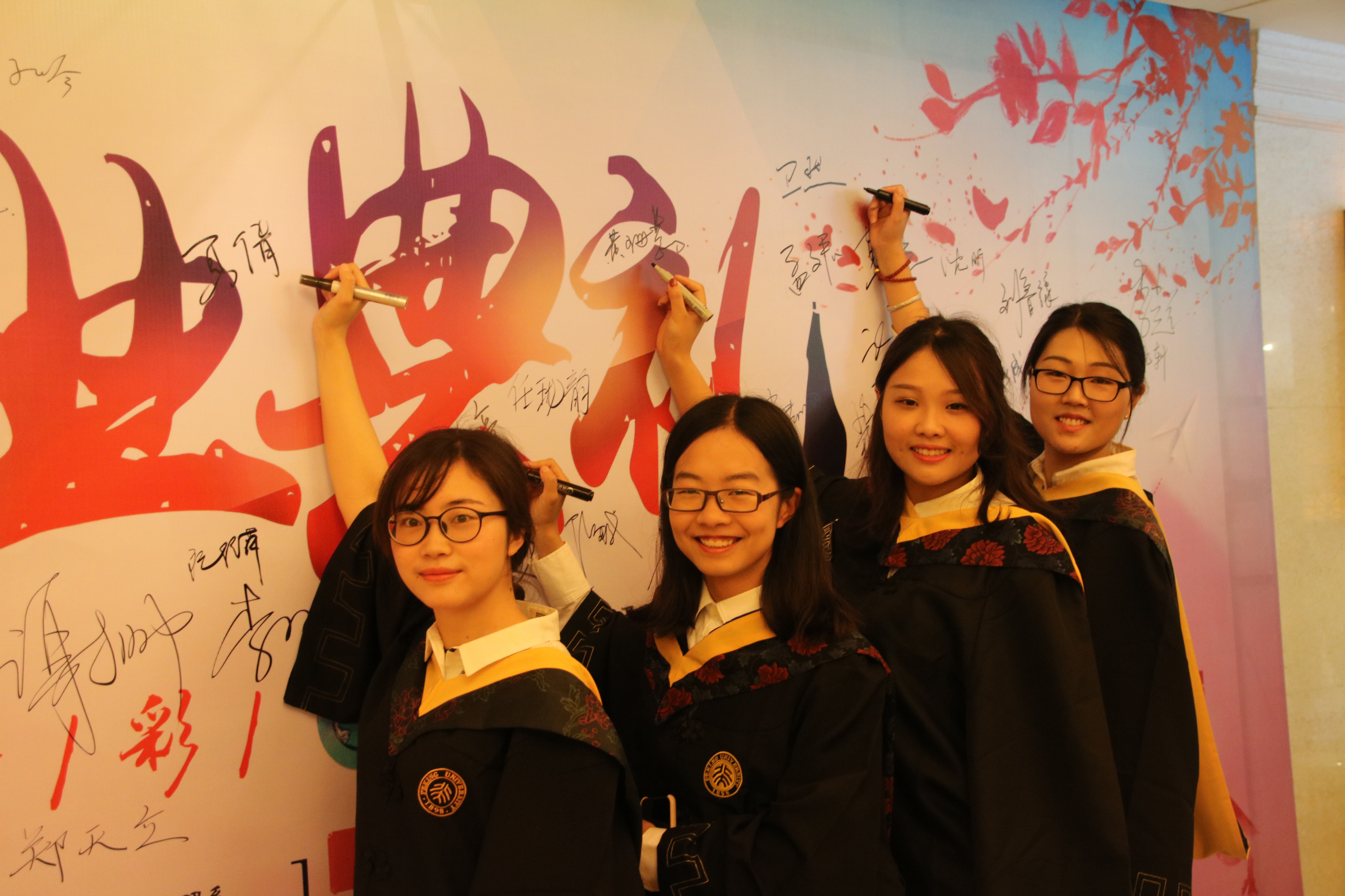 典礼开始前,毕业生们纷纷在毕业纪念签名墙上签名、合影留念,收获的喜悦中带着离别的不舍。同样带给大家惊喜的还有学院为全体毕业生精心制作的纪念册, “今天,东风桃李,明天,巨木成林”。翻开册子,一张张笑脸,一幅幅画面,让人们想起了在城环学习、生活的点点滴滴。