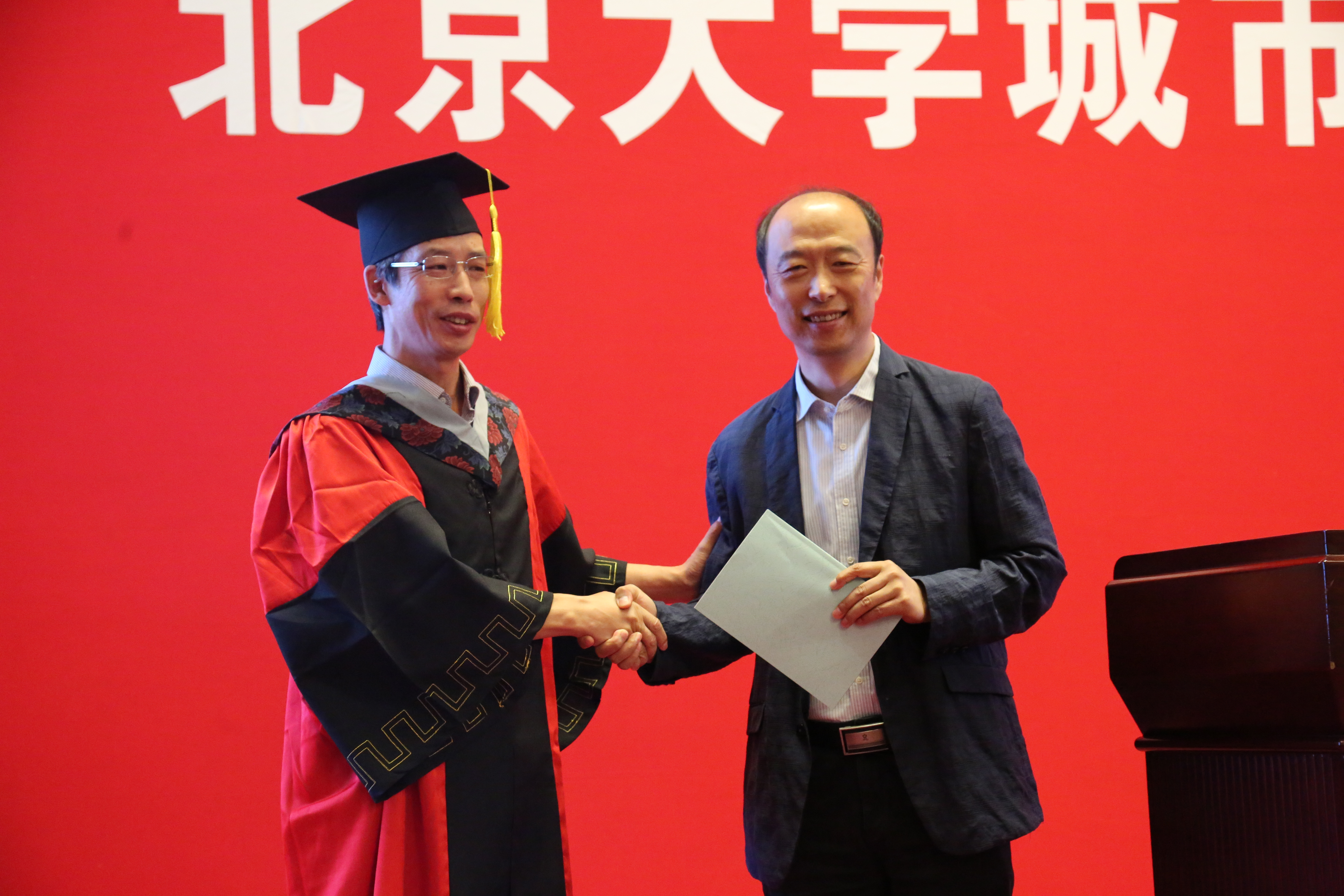 随后,84级院友、中国科学院地理科学与资源研究所所长助理、“一带一路”战略研究中心主任刘卫东老师分享了他在北大学习的经历与心得,将“理想、求真、务实、坚持”八个字送给同学们,提醒即将毕业的师弟师妹们要有全球情怀,具有科学精神,能脚踏实地,又要学会坚持。致辞完毕后,党委副书记陈耀华老师向刘卫东院友赠送他当年本科毕业论文留做纪念。