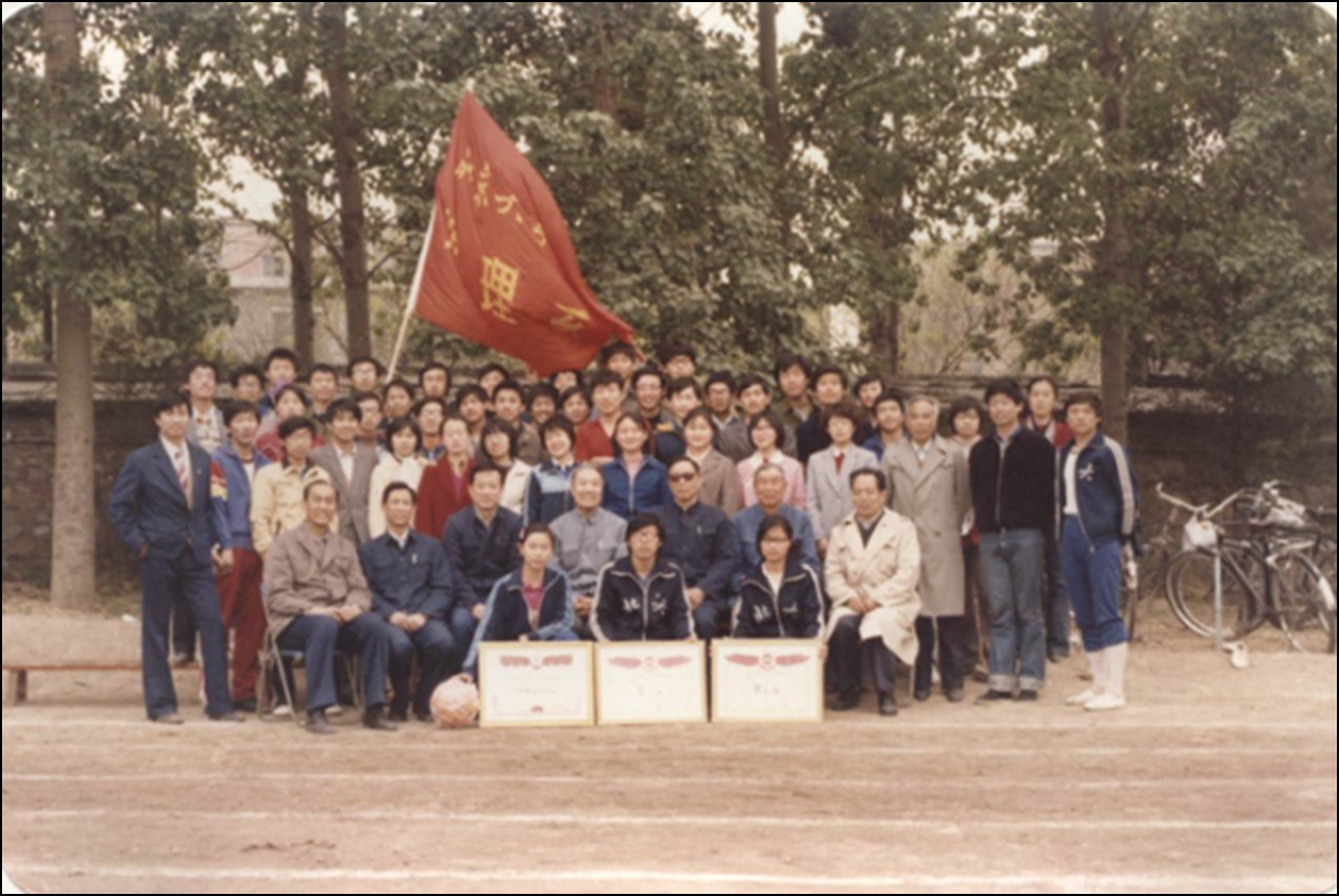 “大获全胜”——地理系历年的体育成果引人注目,1986年校运动会后,地理系获男子团体冠军,女子团体第三,男女总分第一,后部分同学与校领导的合影