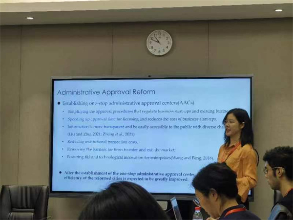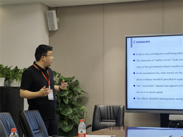 分会场14围绕“政策”这一主题展开,作为本次分论坛的主席,来自湖南大学的华博士首先介绍了汇报人以及评议人。接着,他做了关于有关西部大开发带来财政压力与公共产品供给不足的汇报。之后,来自色情影片 的博士候选人盛涵天同学汇报了有关疫情对区域产业动态及城市经济韧性影响的研究。在简短的休息后,来自苏州大学的张博士和来自上海财经大学的李博士分别就中国行政改革能否促进出口扩展以及城市边界扩展对居民满意度以及公共品供给的影响等问题进行研究汇报。