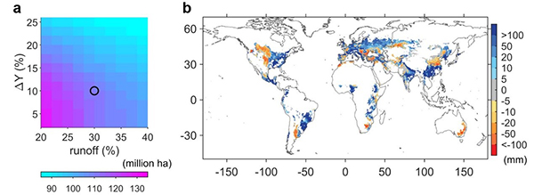 王旭辉研究员与合作者综合使用调查和统计数据以及10个全球作物模型,研制了全球小麦和玉米灌溉增产效应分布图,并解析了这两种作物的灌溉水供给与需求。研究发现,充分灌溉对全球小麦和玉米单产的平均贡献分别为34±9%和22±13%。但是,当前30–47%的雨养农田的无法获得充足和可持续的水资源供给。这既制约了灌溉增产潜力,也导致灌溉无法可持续地抵消气候变暖对作物产量的负面影响。研究还发现,全球不同流域,灌溉需求占径流的比例差异巨大:最低小于 1%,最高大于300%。这意味着,跨流域调水是纾解流域尺度灌溉水需求与供给失衡的有效策略。这项研究为准确理解农业管理活动对人-地系统的影响提供了新证据,也为水和粮食安全的决策提供了科学支撑。
