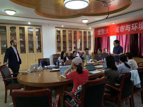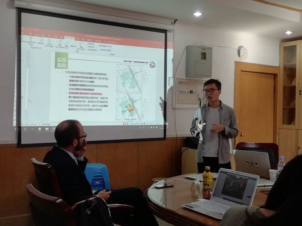 随后,陶印华同学介绍了目前柴彦威教授研究组关于时空间行为与健康城市相关的研究成果,包括时空间行为与健康生活方式、体力活动与居民自评健康、基于个体移动性的噪音与空气污染暴露等,Michael博士就其感兴趣的部分向研究组同学提问并进行讨论。李春江同学介绍了利用结晶生长模型和GPS数据划分15分钟步行可达生活圈的方法,并与Michael博士交流了生活圈划分的技术路径。