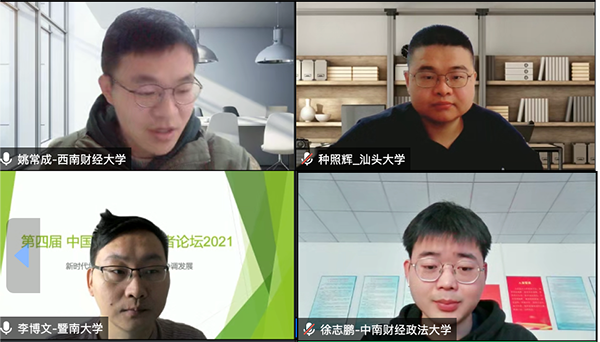 刘涛雄教授主持了下午会议,他探讨了从平台视角看发展,提出一个解释区域经济发展的新框架。郑雨涵研究了新冠肺炎疫情下城市弹性测度及其影响因素。刘子亮从人力资本积累、企业全要素生产率与宏观经济效率视角研究了区域发展中的路径依赖效应。刘永健分析了城市建设用地价格扭曲与中国产业结构演进关系。王瀚佑探讨了互联网信贷、劳动生产率与企业转型应对。潘爽基于出口技术复杂度的考察研究了数字经济如何赋能外循环。