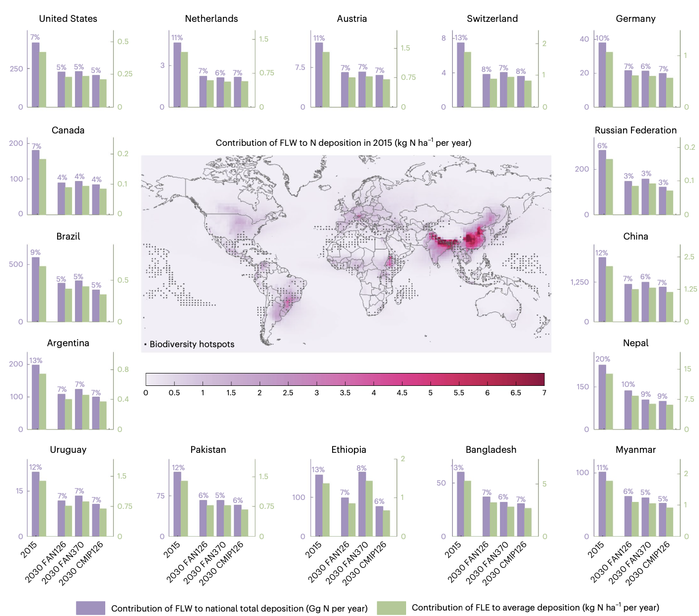 图2 食物损失浪费治理的生态效益。中间图为在2015年去除食物损失浪费所带来的氮沉降下降,周围条形图为代表性国家与地区:2015年去除食物损失浪费及2030年减半食物损失浪费所带来的总氮沉降(紫色柱;左轴)和氮沉降强度(绿色柱;右轴)下降。2030年基准情景包含三个社会经济-气候路径下的排放情景。