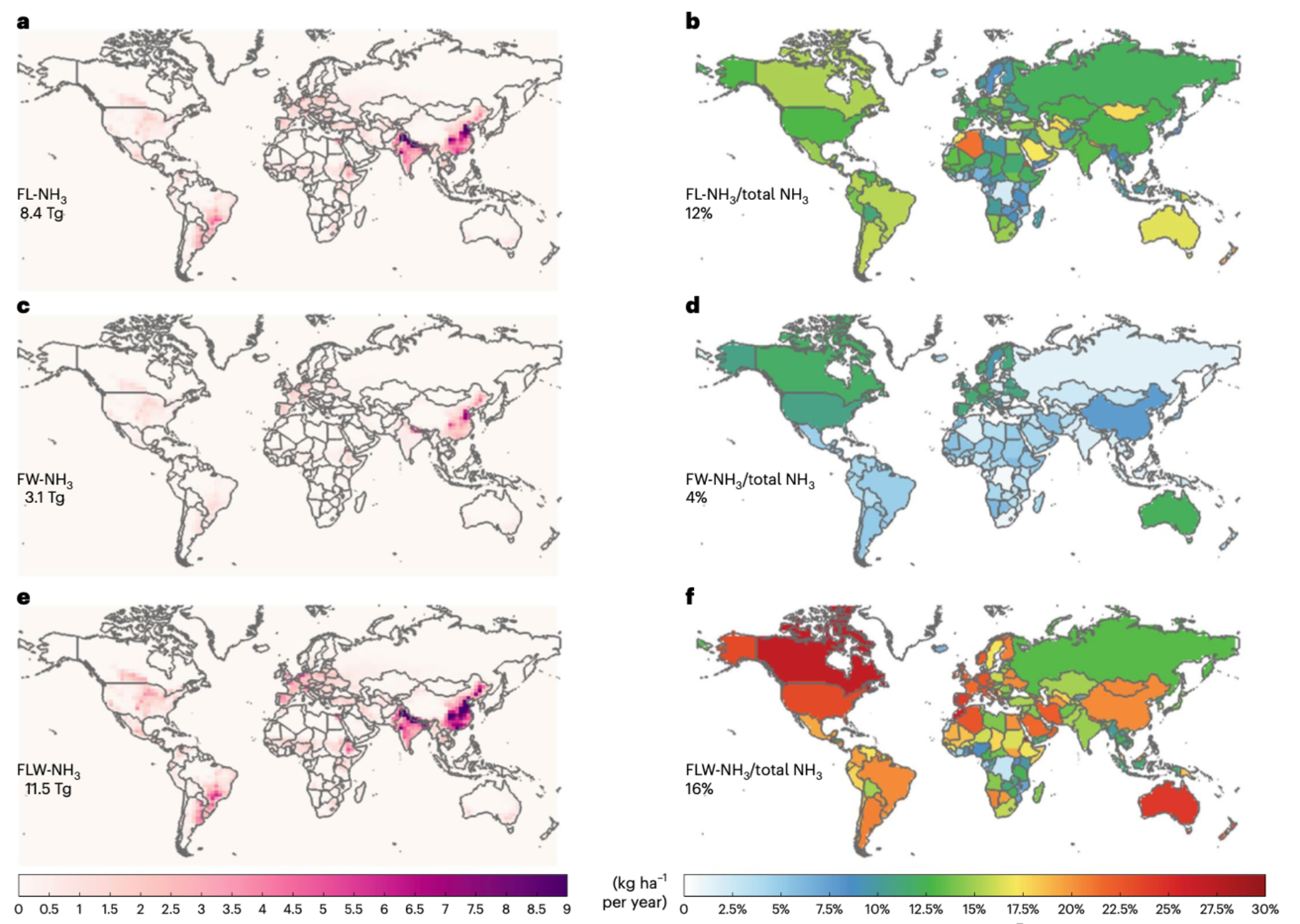 图1 2015年全球食物损失(FL)与食物浪费(FW)对氨排放的贡献。a、c和e为对氨排放的贡献(单位:kg NH3/ha/年),b、d和f为对总人为源氨排放的贡献(单位:%)