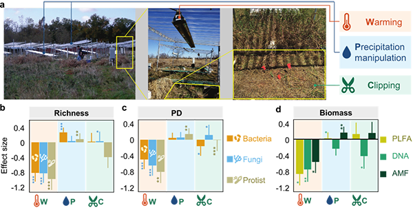 a,样地实验设置。b-d, 增温、降雨量改变和剪草处理对微生物物种丰富度(b)、系统发育多样性(c)和生物量(d)的影响。