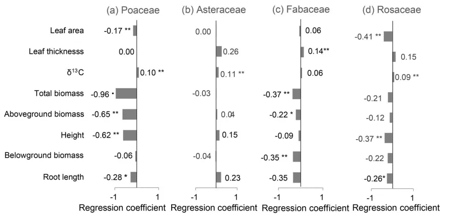 随干旱指数的增加,须根系C4植物与直根系C3植物/须根系C3植物的功能属性响应相反。研究发现,干旱对须根系C3植物的总生物量、地上生物量和株高的影响都强于对直根系C3植物和须根系C4植物(图3),而对主要由须根系C3植物组成的科(禾本科)的影响也强于对主要由直根系C3植物组成的科(菊科、豆科和蔷薇科)(图4)。