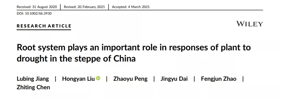 我院2016级生态学专业学生蒋璐冰同学拔尖计划研究成果“Root system plays an important role in responses of plant to drought in the steppe of China”以第一作者在《Land Degradation & Development》发表文章。