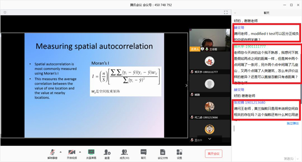 作为《生态学研究进展》的助教,我努力完成教师与同学之间的沟通协调工作。在线上课过程中,我首先做好本职工作:课前建立微信群通知课程安排,课上不断调试直播软件以求达到最好效果,课后收集同学的问题和建议积极反馈。同时也不厌其烦解答同学操作疑惑,督促同学参与交流,提示同学准时上课。在非常时期,希望用自己的力量帮助同学做到“智慧学习”、“智慧抗疫”。