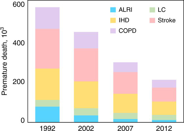 图1. 1992-2012年间农村生活源排放造成的PM2.5暴露引发的过早死亡人数