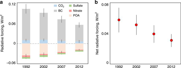 图2.1992-2012年间农村生活源排放的CO2和主要颗粒态污染物造成的辐射强迫