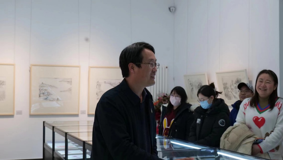 画展现场气氛热烈,师生们在冯健老师的引领下,驻足观赏每一幅作品,不时进行相互讨论和由衷赞叹。展览的作品内容各异,有的作品表现了勺园的荷塘初雪,有的作品展现了静园充满生命力的紫藤,还有一些作品源于冯健老师对生活的感悟,相关作品展示了冯健老师对北大精神、对学者与社会关系以及对人与自然关系的理解,给师生们带来了深刻的艺术享受。随后,师生们进行了短暂的交流讨论,大家表达了观赏画展的体验与心得,认为冯健老师兼具地理科学研究者和书画创作者这样的身份,是人文和地理跨学科育人的典范,艺术教育可以给师生带来愉悦,提供心理减压。冯健老师分享了自己创办画展的初心以及对当代艺术发展和人文情怀的理解。与此同时,城环团委提出,拟聘请冯健老师担任学院同学的“美育导师”,接下来学生的美育系列活动将蓬勃开展,希望帮助城环学生培育美的欣赏能力,提升对自我和世界的认知体验,全面成长成才。