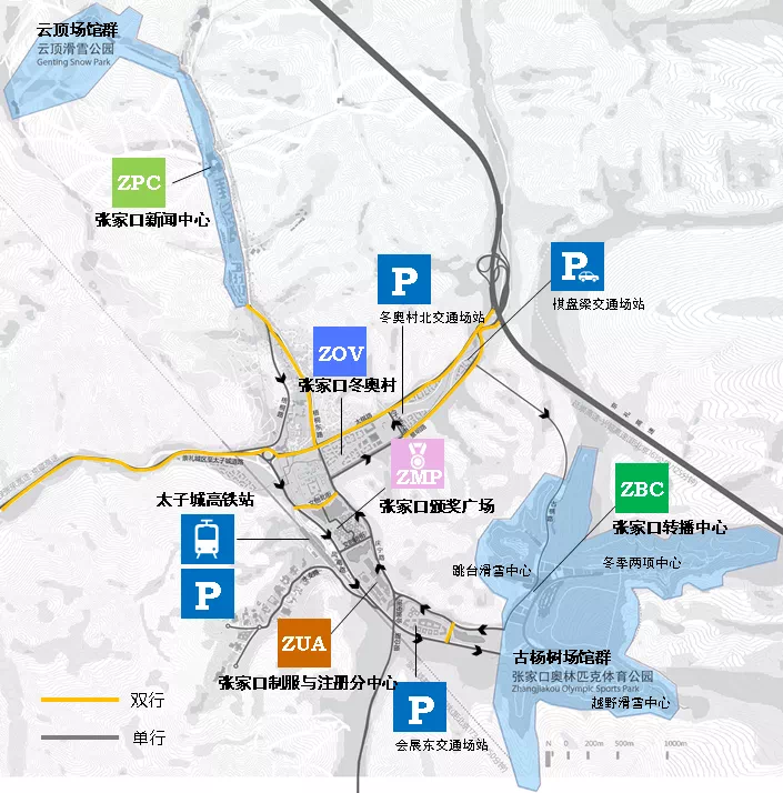 张家口赛区核心区是张家口赛区所有竞赛场馆和非竞赛场馆所在区域,也是赛区铁路交通枢纽太子城高铁站所在地,是赛事交通出行的重点保障区域。规划团队针对赛事出行需求,对张家口赛区核心区道路交通提出单行组织方案,最大程度减少流线交叉;同时对核心区内各类场馆、场站、高铁站等交通设施出入口与道路的关系、车辆在整合核心区内的运行流线进行全面整合与优化,以减少车辆流线交织、降低与道路连接的出入口等节点的交通拥堵,提高核心区道路及其他交通设施整体运行效率。