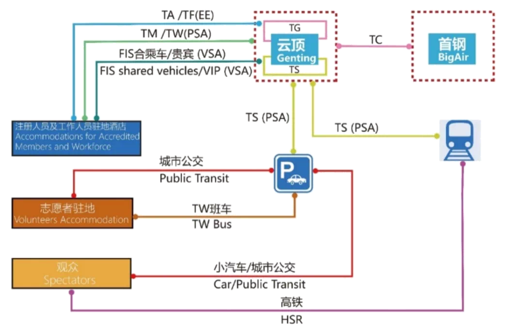 在大型赛事中,场馆设施及服务是赛事能否取得成功的根本,规划团队在场馆交通设施规划的过程中,充分考虑了参加冬奥会的8类客户群不同的出行特点及出行需求,按照优先级分别设置各客户群的停车场和上落客位;并结合山地场馆的地形地貌、因地制宜安排各类交通设施和交通流线,以满足车辆通行的坡度、宽度等硬件要求;同时按照安保政策和防疫政策的要求,在场馆前后院区域分别设置交通设施,保证闭环内外区域流线不交叉、前后院流线不交叉。