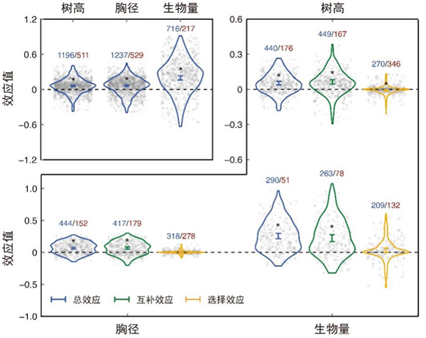 研究发现,混交林的树高、胸径和生物量均显著高于纯林,平均增加量分别为5.5%、6.8%和25.5%。分析表明,这种增产效果主要由种间互补作用所致(见图2)。进一步分析发现,物种性状组成是影响增产效果的关键因素:不同叶型(针叶和阔叶)混交比单一叶型混交的增产效果更好;不同叶生活史(落叶和常绿)混交比单一生活史混交的增产效果更好;不同养分获取策略(固氮和非固氮)混交与单一养分获取策略混交的增产效果相似。