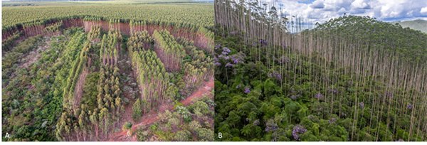 图1:创新性的天然林恢复试点:A-巴西圣保罗州Itatinga圣保罗大学森林实验站的桉树人工林景观中,通过自然恢复、人工辅助的自然恢复、人工种植多样本土植物等方式恢复天然林生态系统;在种植有桉树的实验地,桉树在种植5年后采伐,木材收入可用于帮助承担恢复项目的成本。B-巴西圣保罗州Bertioga对桉树人工林进行改造,用药剂杀死桉树,让本地植物群落自然生长,最终恢复为本地原有的大西洋雨林。(图片来源:Paulo Molin和Pedro Brancalion)