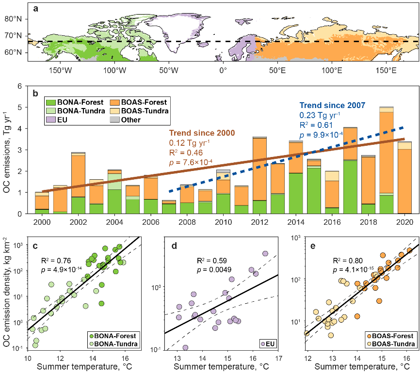在全球气候变化的背景下,北极和亚寒带地区(也称北方地区)的变暖速度远超全球平均水平。这种快速气候变暖与北方地区近年来频发的野火密切相关,如西伯利亚、加拿大等地在2019至2023年间多次受到极端野火的侵袭,引发了科学界和公众的广泛关注。野火活动会释放大量气溶胶进入大气,其通过与辐射、云的相互作用可改变局地气候,对北极地区的影响尤为突出。