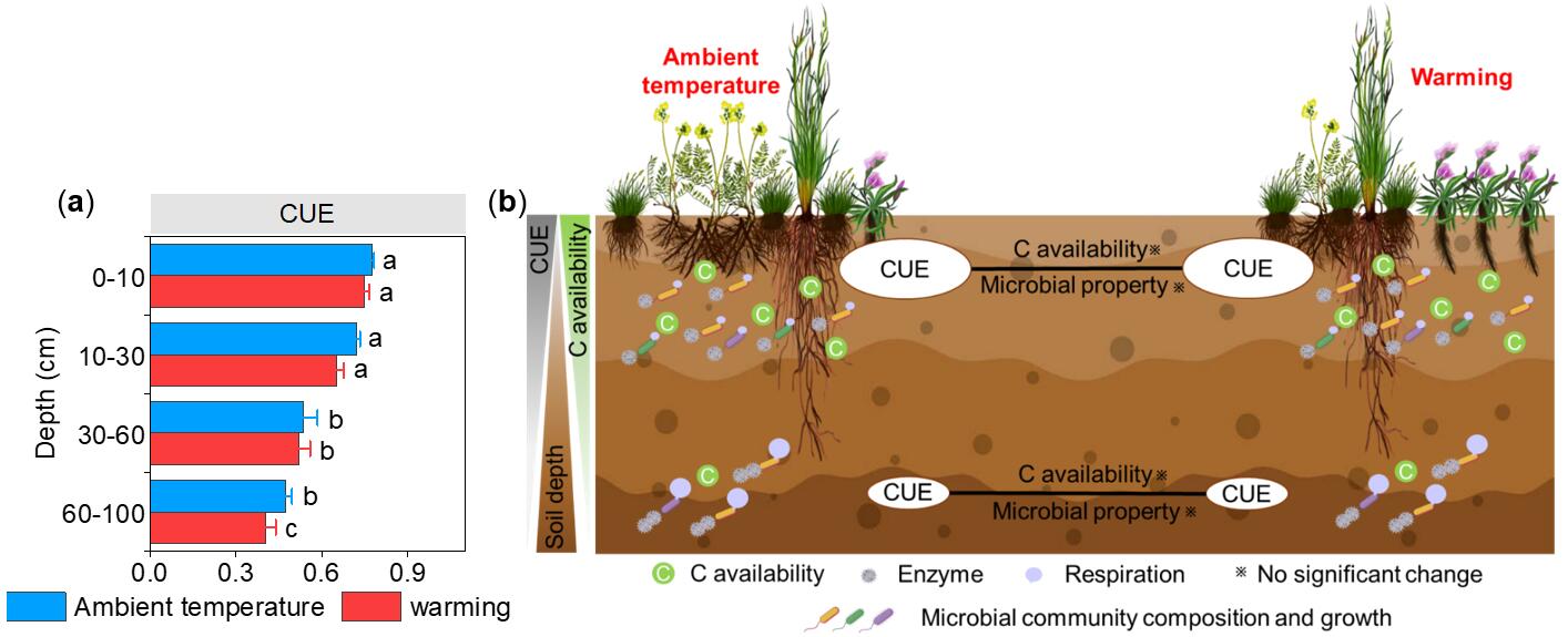 图(a)微生物碳利用效率在全土壤剖面增温下的变化模式。(b)全土壤剖面增温对微生物碳利用效率影响的概念图。