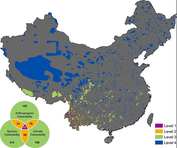 Spatial patterns of species vulnerabilities across protected areas in China.