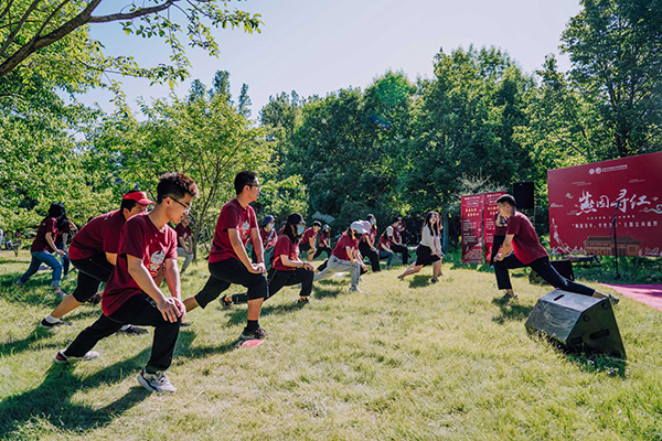 在部队退役归来的2016级本科生李龙盛示范下,参加活动的嘉宾老师带领同学们进行热身活动,“燕园寻红”定向越野活动正式拉开帷幕。