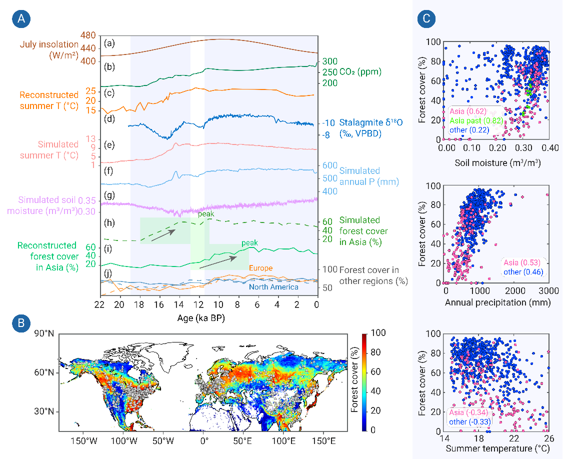 前人研究表明,模式模拟的北半球热带以外地区冰消期森林扩张要早于基于孢粉重建的森林扩张约4000年,这一现象被称为“冰消期森林覆盖之谜”。然而该时滞现象仅在亚洲地区出现,欧洲和北美地区的森林覆盖率的孢粉重建和模式结果具有同步性并同时达峰(图2A)。学术界对该时滞的成因至今仍然存在争议,是植被演变研究领域亟待解决的难题之一。刘鸿雁团队利用卫星观测数据,发现亚洲地区现代森林覆盖率对土壤水的依赖性(相关性)要高于气温与降水,但在欧洲和北美地区,森林覆盖率与土壤水的相关性较弱(图2BC)。在亚洲大范围的半湿润和半干旱区,森林覆盖对土壤水的敏感性要高于湿润区。历史时期的孢粉重建结果表明,亚洲森林覆盖演变与土壤水演变具有很强的正相关性,突出了土壤水在森林覆盖演变中的重要性,而前人的工作忽略了土壤水的作用。研究结果说明,为了更好地预测未来亚洲地区森林覆盖的变化以及精准确定人工造林潜力,需要充分考虑土壤水动态。该研究成果以“The crucial role of soil moisture in the evolution of forest cover in Asia since the Last Glacial Maximum”为题发表在《The Innovation》杂志(//doi.org/10.1016/j.xinn.2024.100594)。色情影片 2018届博士毕业生程颖为论文第一作者(现任陕西师范大学地理科学与旅游学院副教授),刘鸿雁教授为论文通讯作者。
