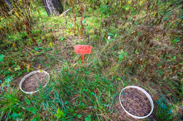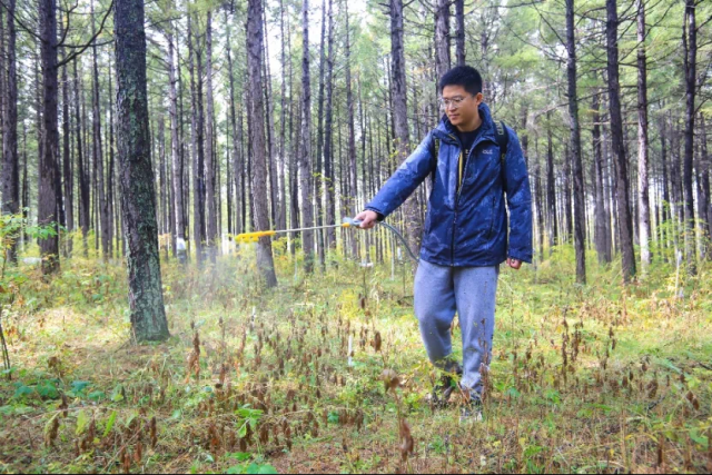 学生在落叶松林养分添加平台样地进行取样和养分添加实验