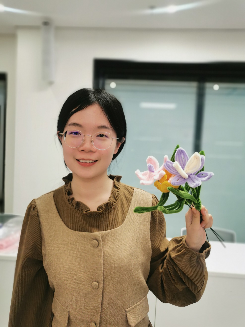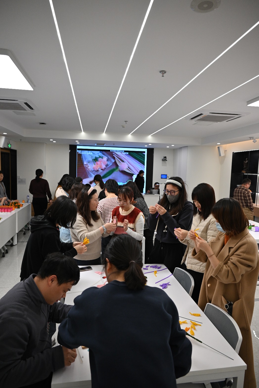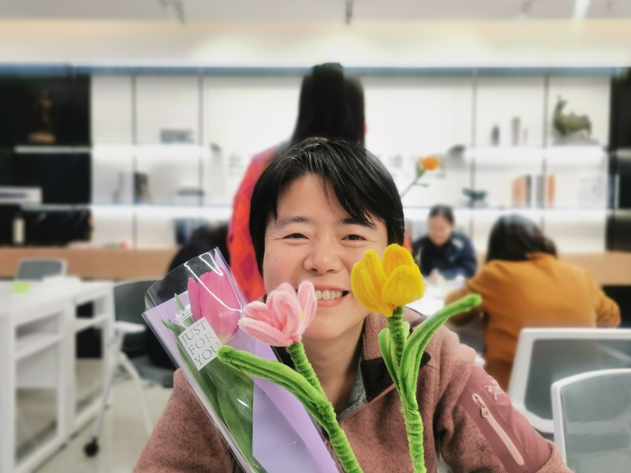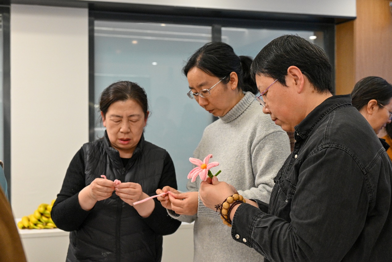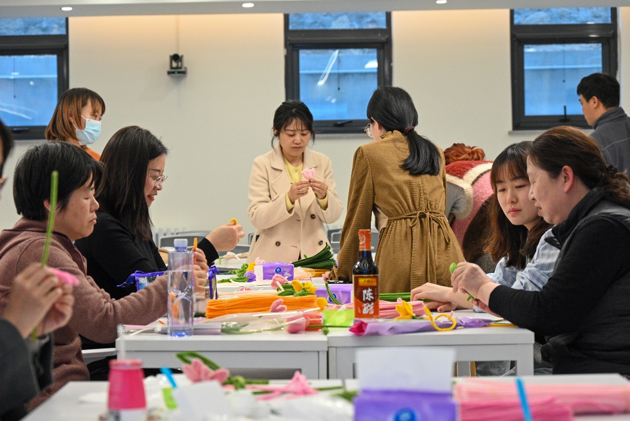 创意手工活动的现场则是另一番热闹景象。轻音乐缓缓流淌,营造出一种温馨而惬意的氛围。桌子上摆着五彩缤纷的扭扭棒、大大小小的杯垫、闪闪亮亮的装饰物……老师们忙碌的身影此起彼伏。她们或低头专注于手中的材料,用灵巧的手指编织,将一根根彩色的扭扭棒变成可爱的花瓣;或三五成群地聚在一起,热烈讨论着设计思路,互相启发,互相学习。空气中弥漫着淡淡的花香和胶水的味道,与老师们欢快的笑声交织在一起,宛如一首动人的乐章,让人陶醉其中。