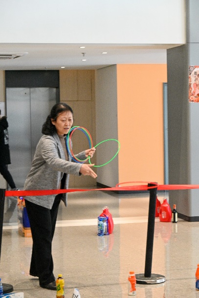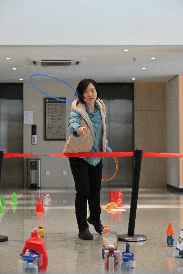 欢声笑语中,趣味套圈活动率先拉开序幕。现场布置得活泼有趣,色彩斑斓的套圈与琳琅满目的目标物品相映成趣,为整场活动注入了无尽的活力。老师们跃跃欲试,手握套圈,眼神中闪烁着期待与兴奋。每一次精准的投掷都伴随着热烈的欢呼与掌声,喜悦之情溢于言表,感染着在场的每一个人。