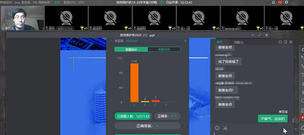 在第一次课的最后,李老师用Classin的答题小工具做了一个小调查,让同学们在线对课程进行点评。从下图可以看到,同学们对课程的满意度还算不错。李双成老师表示,第一次学做“主播”,不免有些拘谨,需要努力完善之处尚多,也需要和同学们一起探索如何提高课程质量。