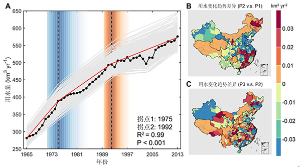 A. 1965-2013年时间变化及拐点;B. 用水变化趋势差异(1975-1992 v.s. 1965-1975);C. 用水变化趋势差异(1992-2013 v.s. 1975-1992)。
