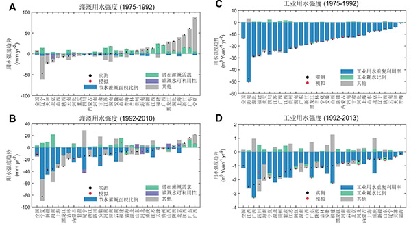 A. 1975-1992年灌溉用水强度变化驱动分析;B. 1992-2010年灌溉用水强度变化驱动分析;C. 1975-1992年工业用水强度变化驱动分析;D. 1992-2013年工业用水强度变化驱动分析。