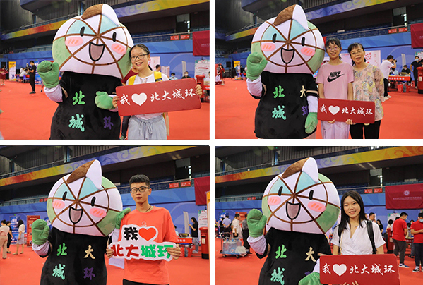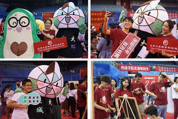 北大城环的吉祥物——城小环早早在现场等候大家。取意于城环地理人的科研学习,城小环是城环人的必备:一只实用轻巧的指北针,为我们指示方向的工具,出野外不可或缺的小帮手!它的配色是象征大自然的蓝色与绿色,代表了城环人对美丽地球、美好环境、城乡融合、乡村振兴等愿景的美好向往。城小环正是勤劳务实、热爱自然、积极实践的城环人的经典写照。迎新现场,新生们竞相与吉祥物合影,把在城环里绽放的第一抹笑容定格于此。