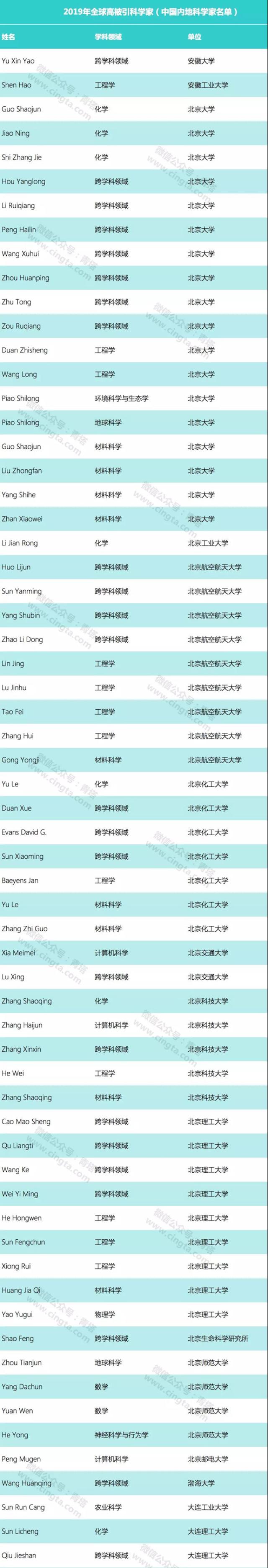 中国内地上榜人数激增,本年度有636人次上榜,而2018年这一数字为482人次。2014年以来,在21 个ESI(Essential Science Indicators)学科领域中,中国内地学者的上榜人数增加了3倍。包含港澳台地区,2019年中国共有735人次入榜高被引科学家。