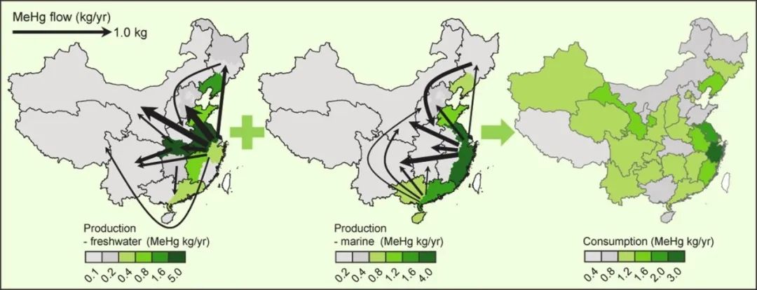 根据本次研究的实验结果,国产蟹类体内含有较高浓度的甲基汞(50–1400 ng/g),与部分海水鱼类甲基汞浓度持平,但却未在甲基汞暴露研究中得到关注。我国年食用蟹类产量中所含有的甲基汞在近20年来快速增长,在2018年达到30 ? 27kg(图2左)。我国蟹产甲基汞产地十分集中,主要分布于东南沿海及少量内陆淡水湖区域,约仅6.8%的国土面积贡献了71%的年蟹类甲基汞通量(图2右)。然而通过跨省食品贸易及进出口,蟹类甲基汞暴露呈现海产蟹类甲基汞从沿海向内陆转移、淡水产蟹类甲基汞从东南向西北转移的趋势(图3)。最终,我国年蟹类甲基汞产量的66%迁移到非产地地区,涉及的人体暴露广泛分布在我国各地。此前的甲基汞暴露研究多注重产地及相关人口暴露,经过贸易迁移而导致的风险转移很少受到关注,严重低估了非沿海地区及非重点水产产地的甲基汞人体暴露,应引起重视。