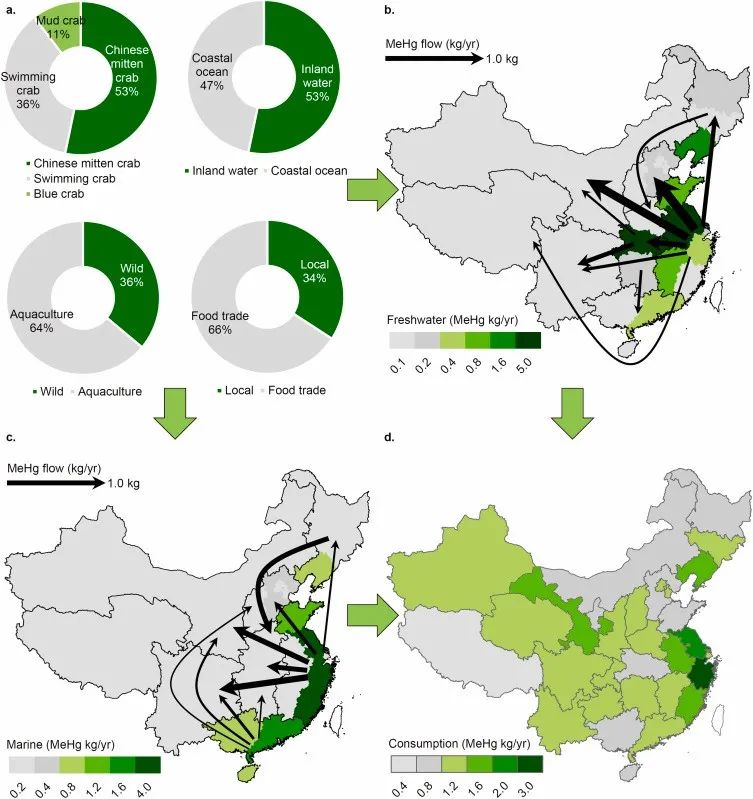 甲基汞(Methylmercury, MeHg)作为自然界中汞元素的常见存在形式之一,是一种生物毒性物质,对于人体具有极高的神经毒性,发育期婴幼儿及孕期妇女为其主要敏感人群。甲基汞常见于水体及生物体中,通过食物摄入少量即能发挥巨大毒性,食物摄入也是甲基汞暴露的主要渠道。近年来,人体甲基汞暴露研究主要集中在海水鱼类如金枪鱼等高甲基汞浓度生物及东亚地区大米等低甲基汞浓度、高摄入量的食物种类之中,对于其他食物种类的甲基汞含量及人体暴露贡献的研究较为匮乏。本研究以中国产蟹类为切入点,定量地研究了国产蟹类甲基汞的年总产量、迁移途径及最终对于人体甲基汞暴露的贡献(图1)。