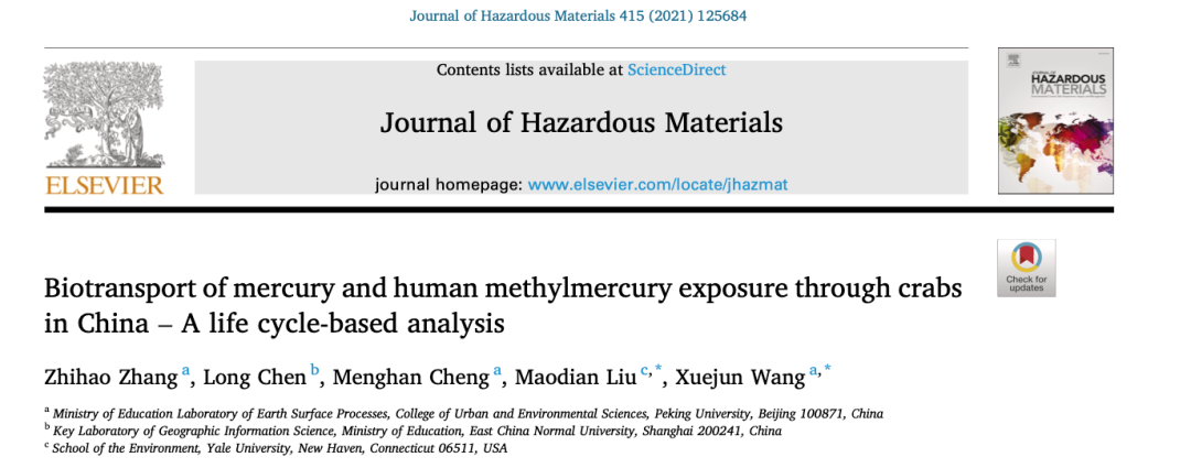 我院2017级环境科学专业学生张志皓同学拔尖计划研究成果“Biotransport of mercury and human methylmercury exposure through crabs in China - A life cycle-based analysis”以第一作者在《Journal of Hazardous Materials》发表文章。