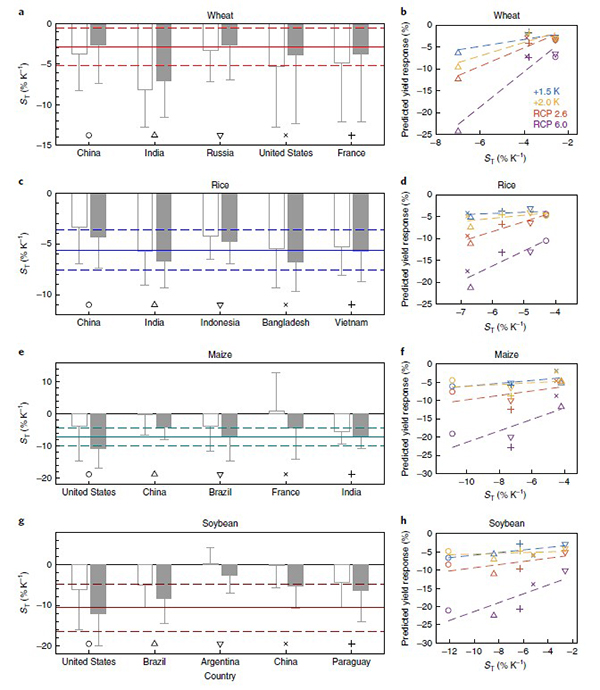 王旭辉研究员的研究团队通过设计贝叶斯条件概率统计方法,将全球48个增温实验数据与全球作物模型相结合,重新评估了四种主要粮食作物对气温上升的响应。研究结果表明,1摄氏度的升温将导致小麦、水稻、玉米和大豆分别减产 2.9±2.3%, 5.6±2.0%, 7.1±2.8%和10.6±5.8%。相较于全球作物模型的估计,这一新方法克服了增温实验数量较少空间代表性有限的局限性和作物模型过程和参数的不确定性,将评估精度提高了12%–54%,大幅修正了增温导致全球小麦减产的幅度(较以往研究降低50%)。文章进一步指出,未来气候变暖将导致各主要产粮国的粮食产量普遍降低。但在同样的增温幅度下,美国和印度的作物产量减少幅度将比中国更大(图1)。即便实现《巴黎协定》约定的将全球平均气温较前工业化时期上升幅度控制在2摄氏度,全球四种主要粮食作物仍将减产3%-13%。该研究为推动全球和区域尺度作物模型的完善以及为后《巴黎协定》时期缓解与适应气候变化的政策制定提供了有效的依据。